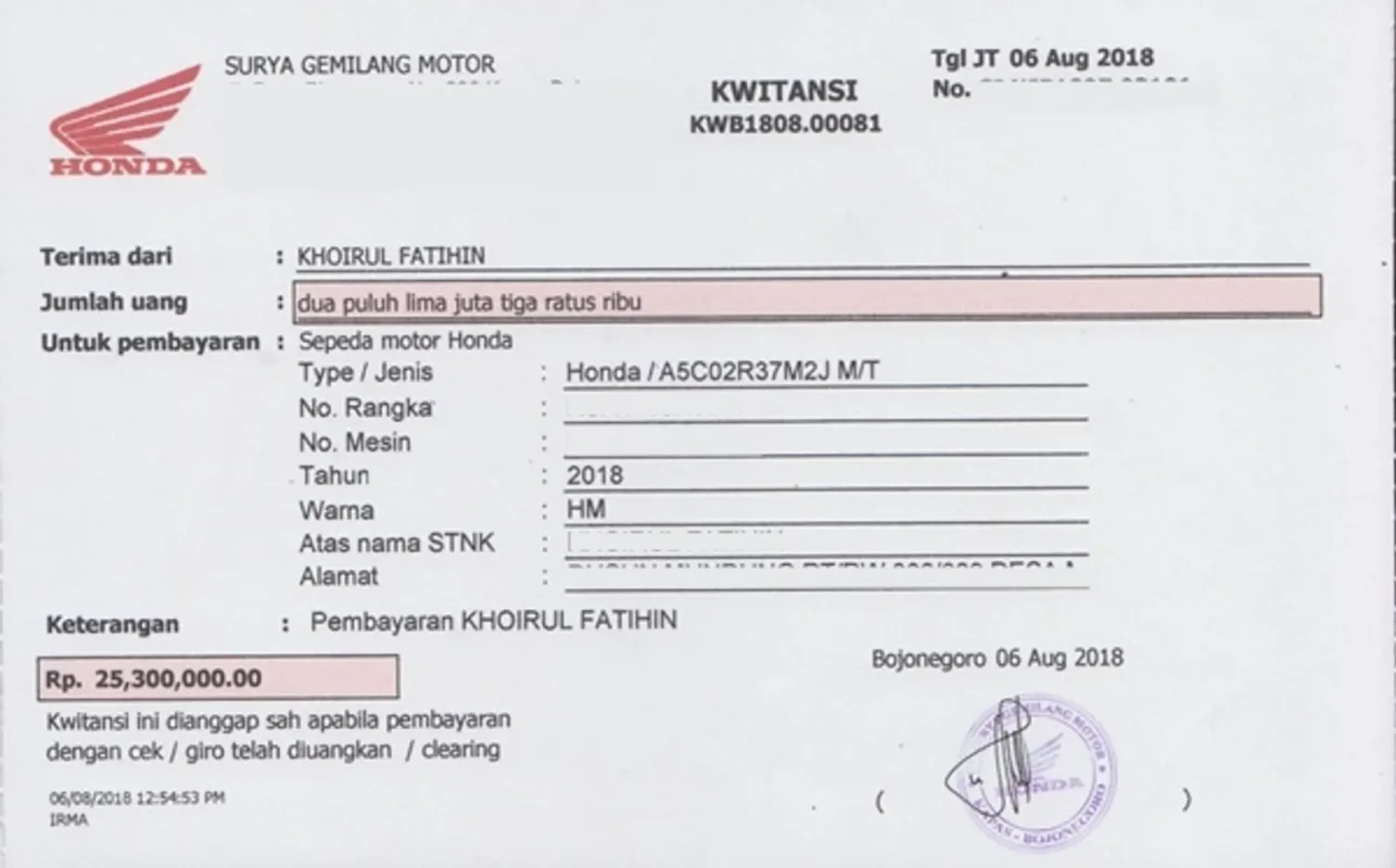 - Detail Motor: Merek, tipe, warna, nomor polisi, nomor rangka, nomor mesin.